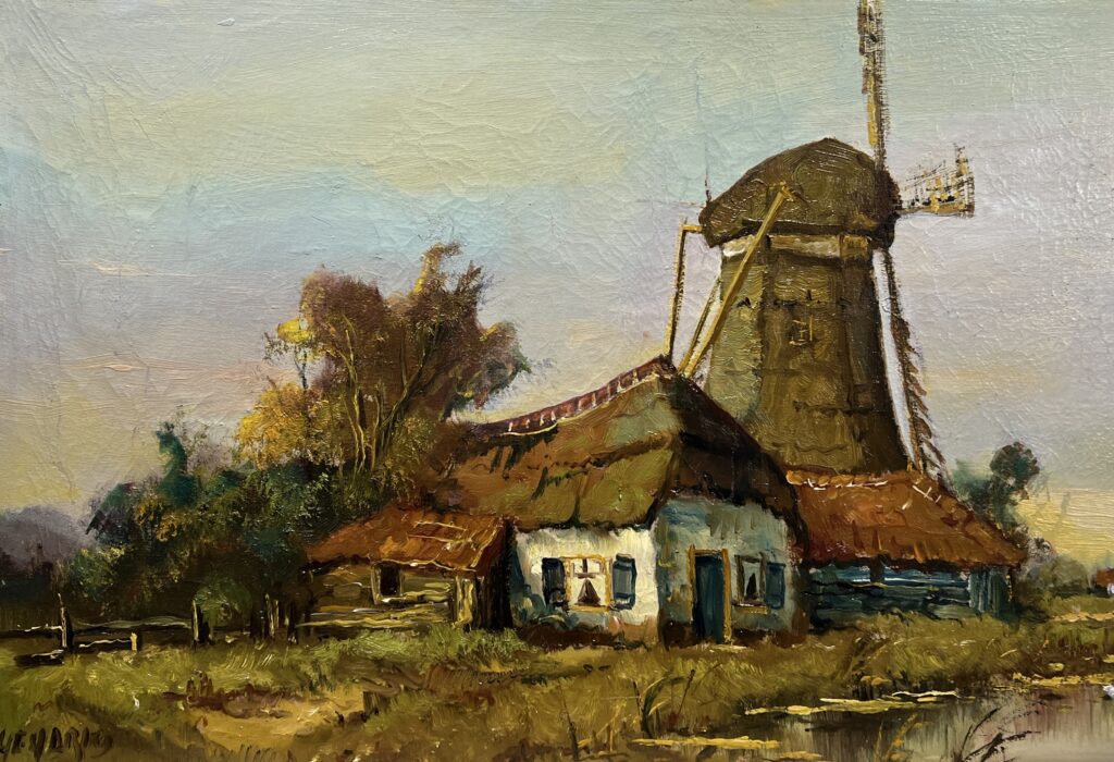 This enchanting landscape captures the serene majesty of a bygone era, where a humble cottage nestles alongside a stately windmill under a sky brushed with the soft pastels of dawn. The artist employs a palette reminiscent of the Dutch Masters, deftly juxtaposing the warm, earthy tones of rust and ochre with the cool, tranquil blues of the wooden shutters. The composition invites the eye to wander, from the rich texture of the foliage, bathed in dappled sunlight, to the intricate architecture of the windmill, a quiet sentinel against the horizon. This evocative piece, tinged with impressionistic warmth, evokes a nostalgic reverie, gently whispering tales of rustic simplicity and pastoral charm.
