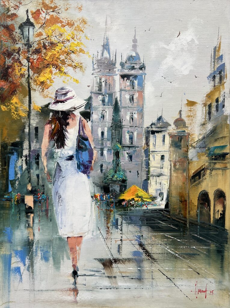 In an enchanting dance of color and movement, this painting captures a solitary figure in a white dress, gracefully striding across a rain-kissed city square. The artist employs broad, confident brushstrokes to evoke an aura of spontaneous elegance. The towering spires and grand arches in the background suggest a European locale, their muted grays and blues juxtaposed against the vibrant autumnal foliage. This contrast heightens the work's dramatic flair, reminiscent of Impressionist masters. The reflective wet pavement adds a dreamlike depth, blurring reality and reflection. The scene is both a celebration of urban life's fleeting moments and a testament to the timeless allure of mystery in motion.