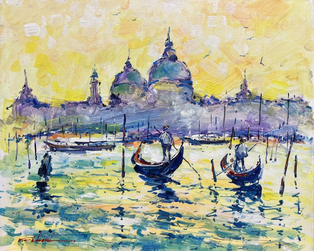 A symphony of color and motion, this evocative piece enchants with an Impressionistic embrace of light and texture. The artist deftly captures the luminous dance of sunlight upon Venetian waters, with gondolas gliding serenely at the forefront. Bold strokes of azure and emerald shimmer across the canvas, reflecting the gentle ripples of the canal, while the silhouette of the Grand Canal’s iconic domes emerges as a dreamy mirage in the background.
