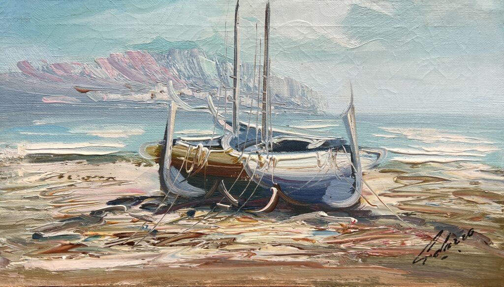 This captivating seascape presents a symphony of color and motion, rendered with the brisk elegance of an artist deeply steeped in the Impressionist tradition. The boats, nestled together with an air of gentle repose, form the heart of the composition, their curved forms dancing with the light. The artist employs a palette of soft blues and earthy browns, contrasted with hints of vibrant pinks in the distant clouds, creating an atmosphere both serene and dynamic. The texture of the paint is applied with a joyous abandon, capturing the shimmering mirage of the sea and the whispering sands beneath. This work exudes a playful yet meditative quality, inviting viewers to linger in its tranquil embrace and to perhaps hear the distant call of a seagull on the breeze.