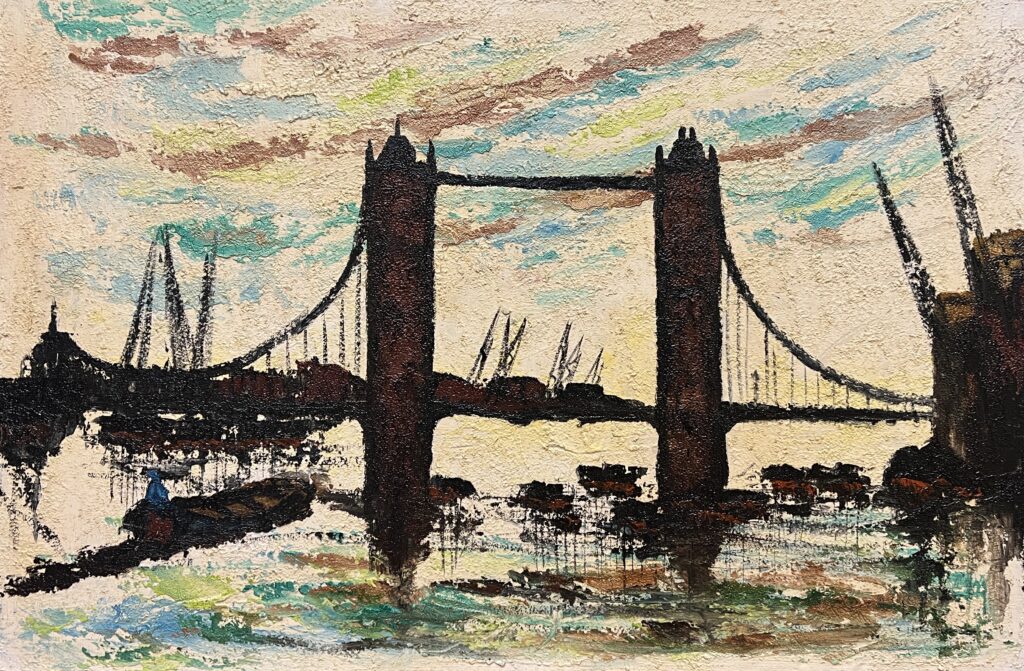 This intriguing piece melds an unmistakable modernist touch with a hint of impressionistic flair, capturing the timeless silhouette of the iconic bridge bathed in a vibrant yet gentle sky. The textured canvas invites contemplation, where the artist’s audacious brushwork enlivens the air with turbulent energy. The palette, a symphony of earthen browns meeting pastel skies, masterfully evokes a sense of whimsical nostalgia. The stark contrast between the towering, shadowy structure and the playful dance of water below adds depth and intrigue, as if inviting us into an otherworldly river of dreams. This painting is not merely a vision but an invocation of urban poetry.