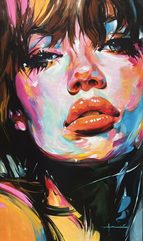 This captivating portrait dances on the edge of expressionism, bathing us in a symphony of vibrant, kaleidoscopic hues. The artist's bold, gestural brushstrokes conjure a visage that is at once tender and fierce, as if whispering secrets only the canvas can hold. The subjectβs lips, rendered in audacious reds and pinks, become the focal crescendo, drawing the viewer into an emotive embrace. Flecks of turquoise and soft peach ripple across the face, infusing it with a sense of movement and life. The dramatic contrast with inky shadows adds to the depth and intrigue, evoking a sense of mystery. This piece teeters between dream and reality, suggesting influences of neo-impressionism while remaining delightfully modern and undeniably magnetic.