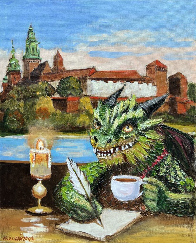 Ah, behold the whimsical marriage of KrakΓ³w's architectural grandeur and fantastical lore in this captivating tableau. The renowned Wawel Castle emerges tall and dignified against a gentle azure sky, its Gothic spires whispering tales of yore. In the foreground, a mischievous dragon, deftly crafted with a nod to both surrealism and the playful essence of folklore, indulges in the pleasures of quill and cup. Each scale shimmers with verdant nuance, juxtaposed against the creamy froth of a steaming beverage. The painter's brush dances with lively strokes, imbuing texture and vibrancy into every corner. A flickering candle casts a warm glow, illuminating the scene with an air of cozy mystery. Such spirited creativity encapsulates a world where history and imagination comfortably sip tea together.