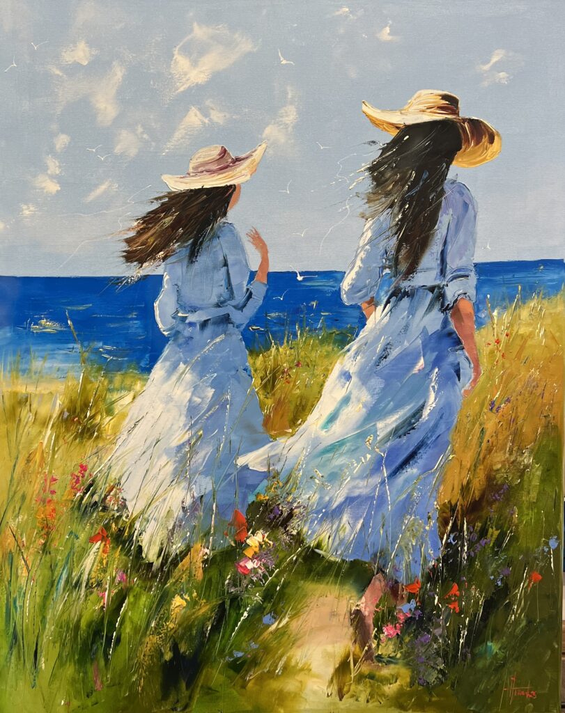 In this vibrant tableau, the artist crafts a delightful dance of colors and forms, capturing a serene seaside moment. Two figures, adorned in flowing blue dresses, walk gracefully through a meadow of verdant greens and wildflowers, with their sun hats hinting at a nostalgic touch of whimsy. The lively brushwork suggests a gentle breeze, animating the scene with movement and spontaneity. Subtle impressionistic influences shine through in the masterful interplay of light and shadow, creating a rich tapestry of hues against the azure expanse of sea and sky. This piece, a celebration of carefree joy and tranquility, invites viewers to lose themselves in its harmonious simplicity.