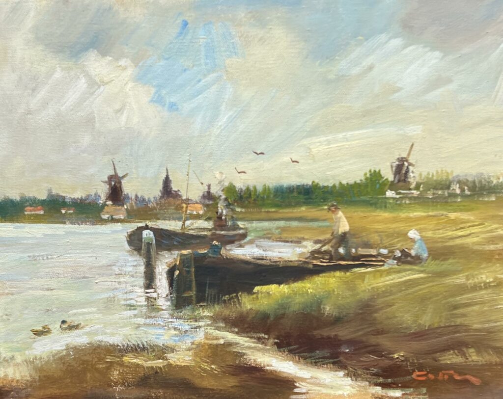In this delightful scene, a serene testament to the artistic eye, we find ourselves whisked away to a bucolic Dutch riverside, seemingly plucked from a dream. The artist employs a soft palette of muted earth tones contrasted with vibrant greens and blues, conjuring the gentle dance of a countryside afternoon. Windmills punctuate the horizon, their elegance echoed by the birds in graceful flight above, hinting at whispers of the past shaping the present.