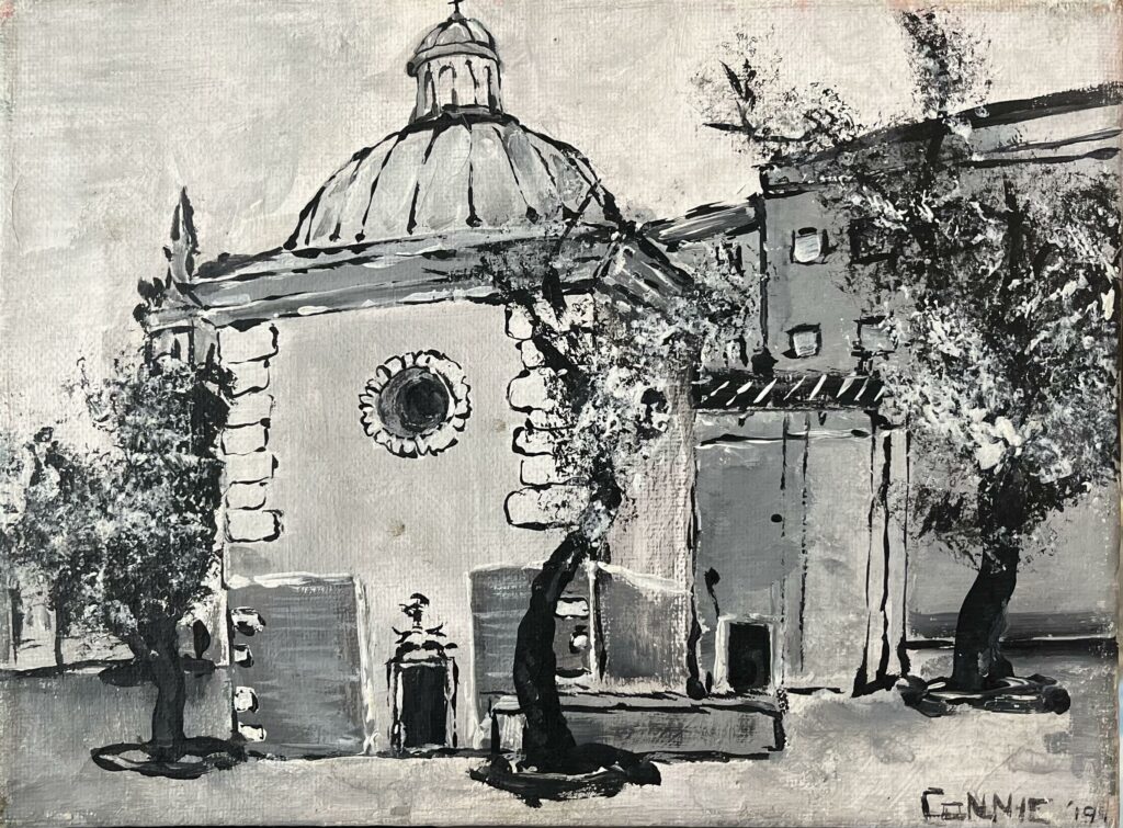 In this enchanting monochrome tableau, a serene chapel stands as the protagonist, its soft curvature and domed crown evoking whispers of Baroque architecture. The artist employs a deft hand, blending shades of gray and inky blacks to conjure a delicate chiaroscuro, imbuing the piece with both simplicity and depth. The stark trees flanking the structure add an air of mystery, their branches dancing with spirited brushwork, reminiscent of Impressionistic vitality.
