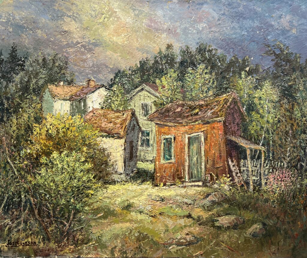 A rustic serenade unfolds in this exquisite landscape, where the artist deftly captures the soul of rural charm with a palette reminiscent of early impressionism. An aura of nostalgia envelops the scene, as sunlight playfully dances upon the textured roofs of quaint, timeworn cottages nestled amidst verdant foliage. The artist's brushwork is audacious yet tender, invoking a sense of movement and life within the stillness of nature's embrace.