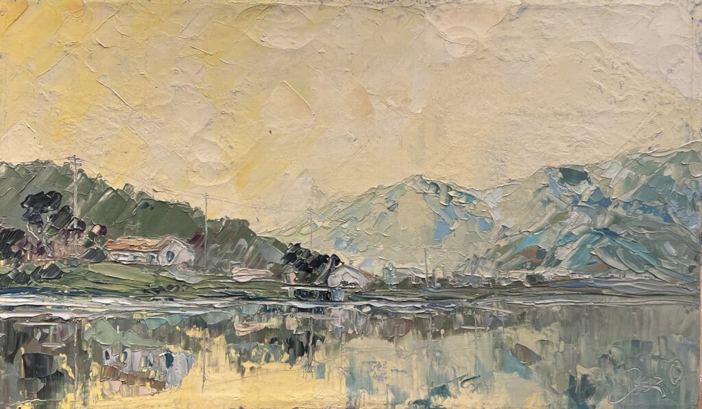 Echoes on the Water is the visual equivalent of a deep breath. Soft mountains lean into a sleepy lakeshore, where houses nap quietly beside their reflections. The sky glows in buttercream hues, suggesting either a peaceful dawn or the kind of late afternoon that stretches time. The thick, textural strokes speak with confidence, yet the mood whispers: Shhh... everythingβs okay here. Itβs a place where nothing urgent ever happensβand that's precisely the point.