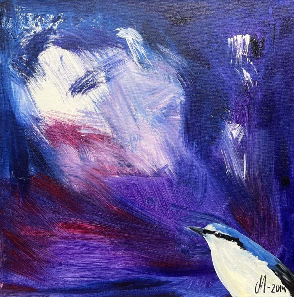 In a vibrant dance between abstraction and reality, this enchanting artwork captivates with its bold interplay of color and form. Dominated by sweeping strokes of azure, amethyst, and cerulean, the canvas whispers of twilight's embrace, while a solitary bird emerges, delicately poised at the brink of this chromatic tempest. The bird’s finely rendered details juxtapose the swirling, almost chaotic background, bringing a touch of realism to the abstract fantasia, reminiscent of the serenity found in Impressionism's more introspective moments. The rich textures pull the eye across the composition, offering a tantalizing journey through the depths of imagination. A delightful exploration of contrast and harmony, the piece is a testament to the artist's deft ability to balance the sublime and the tangible.