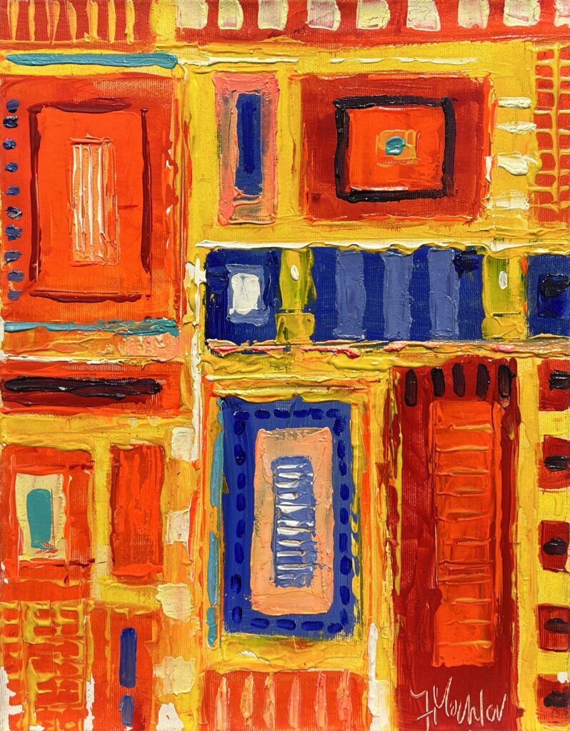 In this vibrant canvas, the artist transports us into a kaleidoscopic symphony of color and form, reminiscent of the exuberance found in mid-20th-century abstract expressionism. Dominated by fiery reds and sunlit yellows, the composition is punctuated with deep ocean blues, creating a dynamic interplay of warmth and coolness. The geometric motifs, while seemingly simple, reveal a sophisticated embrace of rhythm and balance, inviting introspective meditation and a playful spirit. Bold, textured brushstrokes imbue the piece with an invigorating energy, coaxing the viewer to explore each nuance. This work is a jubilant celebration of life’s complexity, evoking the vibrant pulse of urban landscapes distilled into pure abstraction.