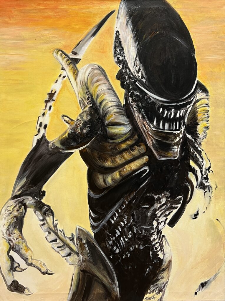 In this striking piece, the artist boldly juxtaposes the world of science fiction with the realm of classical expressionism. The figure, both menacing and captivating, emerges against an explosive background of burnished gold and vibrant orange, echoing the fervor of a setting sun. The intricate play of light and shadow on the creature's sleek exoskeleton creates a dynamic contrast, showcasing the artist's deft command of chiaroscuro. With an almost Baroque intensity, each curve and edge of the form is accentuated, drawing the viewer into a dance of textures and emotions. The work nods to both futuristic and primal elements, crafting a tableau that is as thought-provoking as it is visually arresting. A true emblem of otherworldly elegance.