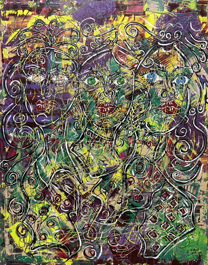 Glimpses of bold faces emerge from the intricate web, their eyes locked in enigmatic conversation, inviting us into their kaleidoscopic world. This interplay of form and color weaves a tapestry of intrigue and allure, reminiscent of Pollock's spirited spontaneity. This piece is an exuberant tribute to the boundless energy of the creative spirit.