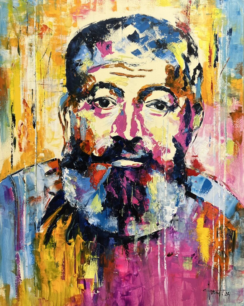 Amidst this kaleidoscope of hues, the subject emerges with a steadfast gaze, inviting viewers to ponder the stories hidden within those painted eyes. The juxtaposition of warm and cool tones constructs a tangible depth, making the piece resonate with an exuberant yet introspective energy. This masterpiece not only captivates the eye but also engages the soul, leaving an indelible mark on all who encounter its radiant charm.