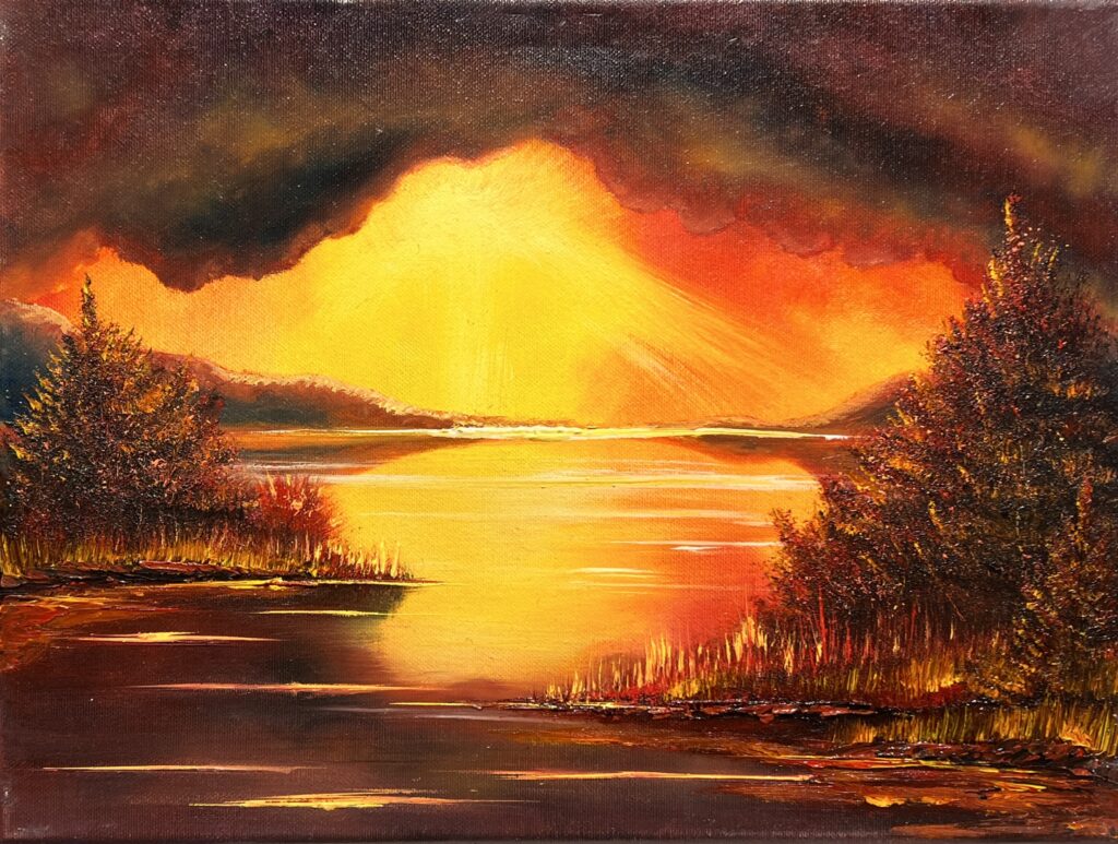 A captivating symphony of fiery hues, this evocative landscape captures the viewer's imagination with its dramatic interplay of light and shadow. The artist employs a rich palette of flaming oranges and deep, sultry browns that cascade across the canvas, evoking both the warmth of a gentle sunset and the tumult of an impending storm. The trees, poised like sentinels, frame the shimmering expanse of water, where the golden light dances and glows with ethereal intensity. This masterpiece, recalling the emotional intensity of Romanticism, invites us to ponder the sublime beauty of nature's raw power. Each brushstroke breathes life into this vivid tableau, leaving an indelible mark on the senses and soul.