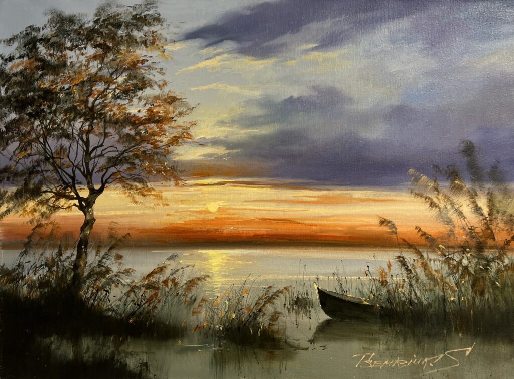 In this evocative tableau, the artist captures the serene majesty of nature's twilight performance, offering a harmonious interplay of light and shadow that suggests the whispered elegance of Romanticism. The composition draws the viewer in with its lone, gnarled tree and a solitary boat nestled amid reeds, both standing in quiet dialogue with a sunset that defiantly brandishes its vibrant oranges and pinks against the encroaching purples of dusk.