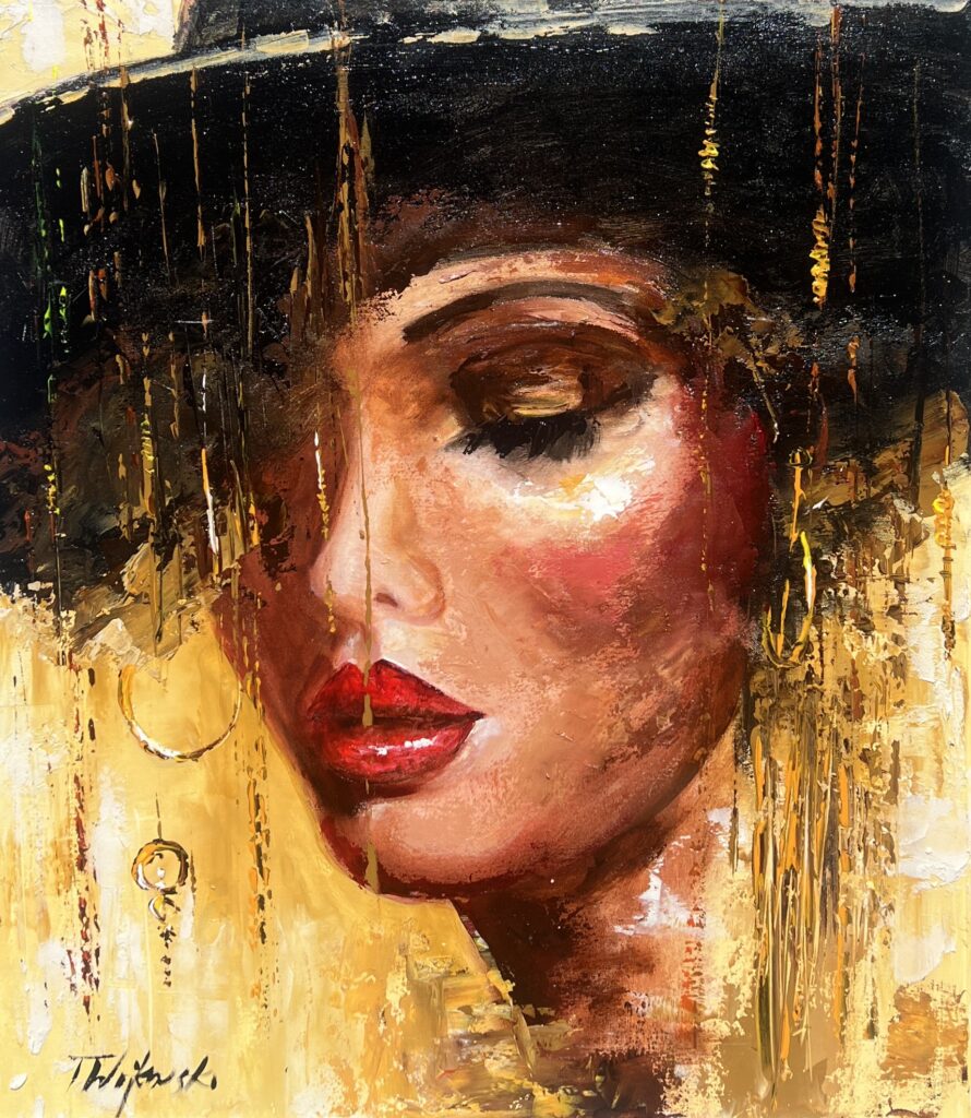 The painter's technique, a symphony of textured brushstrokes, enhances the sensory experience, making the canvas pulsate with life. The interplay of shadow and light creates a mesmerizing depth, drawing the viewer into a silent dialogue with the figure's soulful gaze. Echoes of Klimt’s decorative fervor linger in the gold-hued accents, whispering secrets of elegance and sophistication.