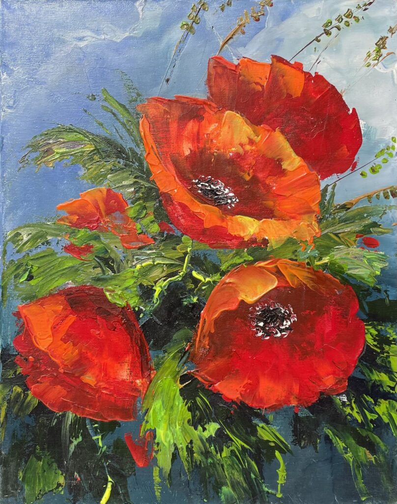 In a vibrant dance of color and form, this exquisite piece captures the essence of floral exuberance with a nod to the Impressionist masters. The bold, fiery poppies dominate the canvas, their petals ablaze with rich reds and oranges, offering a sensual contrast to the serene blue background. Each brushstroke carries an exuberant energy, creating a sense of movement and life.