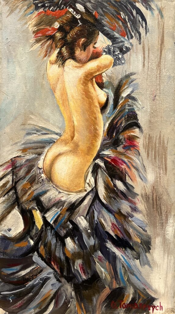 In a wild yet graceful dance of colors, this evocative painting captures a moment of serene introspection intertwined with exuberant movement. The artist deftly plays with contrasts: the smooth, sensual curve of the subject’s body juxtaposed against the chaotic flair of her feathered adornments. A palette of warm earth tones and striking reds and blues meld together, invoking a sense of both intimacy and dynamism reminiscent of the Impressionists. The composition flows in a harmonious whirlwind, drawing the eye in a rhythmic spiral. This piece not only captivates with its vivid depiction but also whispers the secrets of a mystical narrative woven through brushstrokes full of passion and flair.