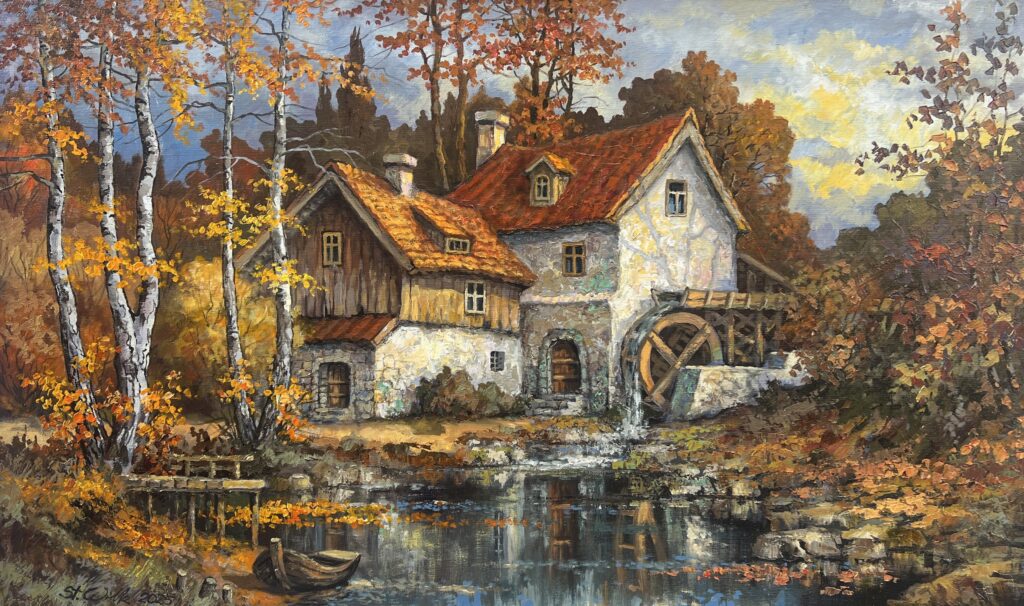In this captivating canvas, the artist paints a pastoral idyll that whispers of nostalgia and whispers of rustic charm. The scene, a quaint watermill nestled amidst a carpet of autumnal leaves, draws the eye with its rich tapestry of warm oranges, ochres, and deep browns. The play of light on the textured stone and timber transports one to a forgotten era. The reflection in the tranquil water adds an exquisite symmetry, while the delicate birch trees stand sentinel, their slender trunks stark against the foliage. There's a touch of the Romantic, reminiscent of a pastoral memory where time graciously slows. This work, a symphony of color and texture, promises to evoke both warmth and wonder in its beholder.