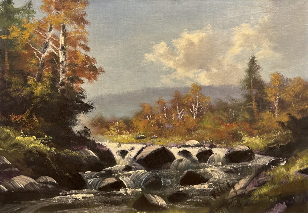 In this captivating landscape, a tranquil river meanders through a golden autumn tapestry, reminiscent of the idyllic idylls of the Romantic period. The artist masterfully employs a rich palette of warm ochres and burnt siennas, set against the delicate blues and grays of a slightly overcast sky. The paint strokes are swift yet deliberate, suggesting both movement and stillness as the water cascades over smooth, time-worn rocks.