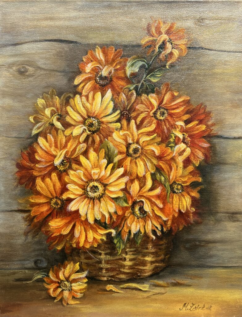The wooden backdrop, with its subtle texture, grounds the composition and allows the blossoms to radiate joy and vitality. Each petal, lovingly rendered, seems to whisper tales of sun-drenched fields and tender breezes. These vivacious blooms, though quietly arranged, exude an irresistible charisma and invite one to linger, savoring their timeless beauty.
