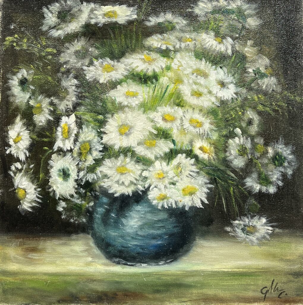 In this exquisite bouquet of daisies, we witness a masterful interplay of light and texture, reminiscent of the gentle brushstrokes of the Impressionist movement. The artist captures the ephemeral beauty of these humble blossoms, their white petals glowing softly against a shadowy, muted background. The contrast between the vibrant greens and yellows and the dusky tones creates a dynamic yet serene tableau, suggesting a moment frozen in time. The bouquet, housed in a delicately rendered ceramic vase, evokes a sense of grace and tranquility, while the composition invites the viewer to linger amidst this quiet reverie of nature's fleeting elegance.