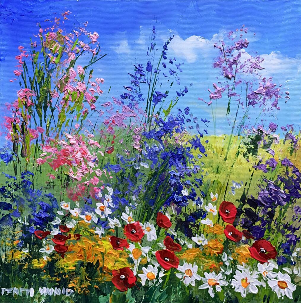 In this enchanting tableau of floral ebullience, the artist employs a vivid dance of colors reminiscent of Impressionist gardens, where nature's spontaneity reigns. Bold strokes of ruby reds and crisp whites emerge vibrantly against a celestial azure sky, with joyous bursts of lavender, pink, and green creating a symphonic celebration of color. The piece deftly balances the chaos of untamed blooms with an underlying harmony, inviting the viewer to lose themselves in the delicate interplay of texture and light. Each petal seems to whisper tales of a gentle breeze, capturing a fleeting moment of verdant exuberance, as if Monet himself had whimsically conspired with a more contemporary brush. The painting is a joyous ode to the ephemeral beauty of a summer's day, daring us all to bask in its ever-eclectic glow.