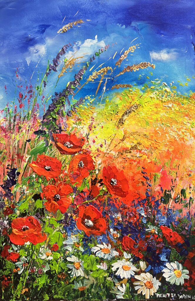 In this vibrant tableau, a jubilant dance of poppies and daisies bursts forth under an effervescent sky, evoking the playful spirit of a sun-drenched afternoon. The artist employs a bold impasto technique, lending a tactile mosaic of texture that seduces the viewer into its labyrinthine layers. A riotous palette of scarlet, gold, and verdant green is punctuated with strokes of azure and cerulean, crafting a symphony of natural exuberance reminiscent of Impressionist reverie.