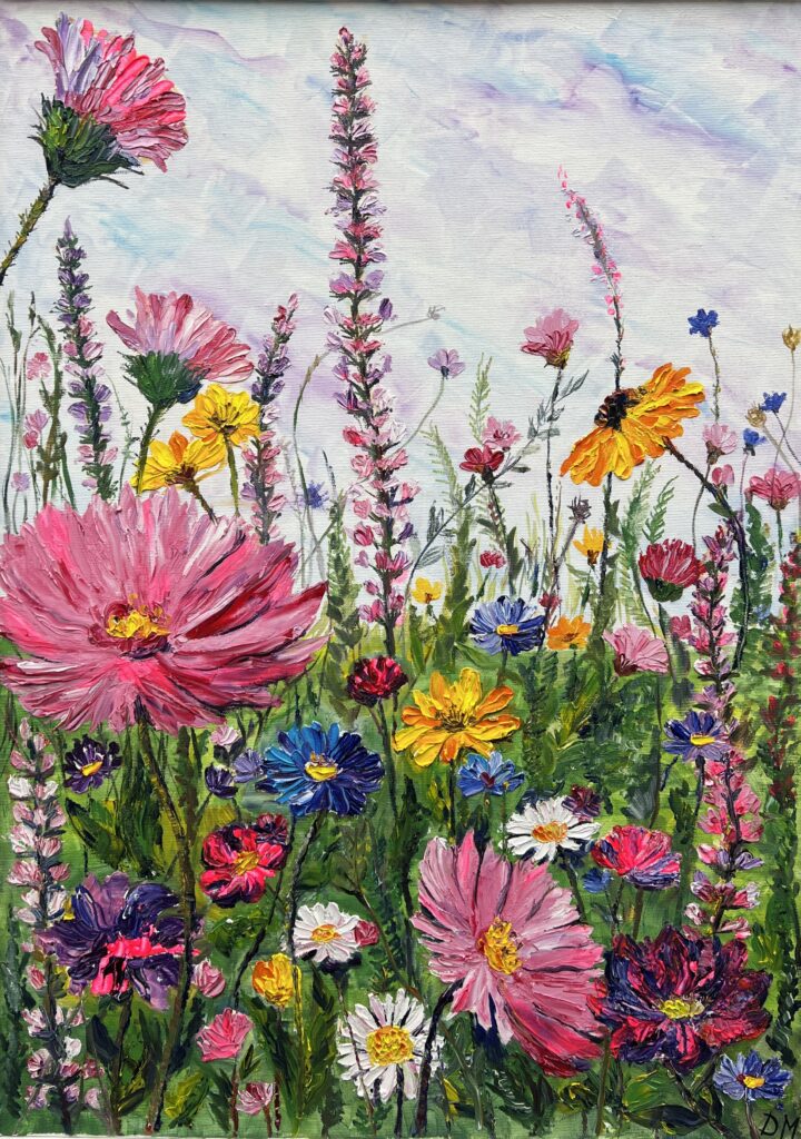 Lavish pinks and purples stand proudly against a tapestry of green, while audacious pops of yellow and blue weave through this floral symphony, capturing the eye and heart alike. Each flower, meticulously sculpted with thick, textured strokes, embodies the tactile pleasure of oil paint, inviting one to almost feel the petals' soft caress.
