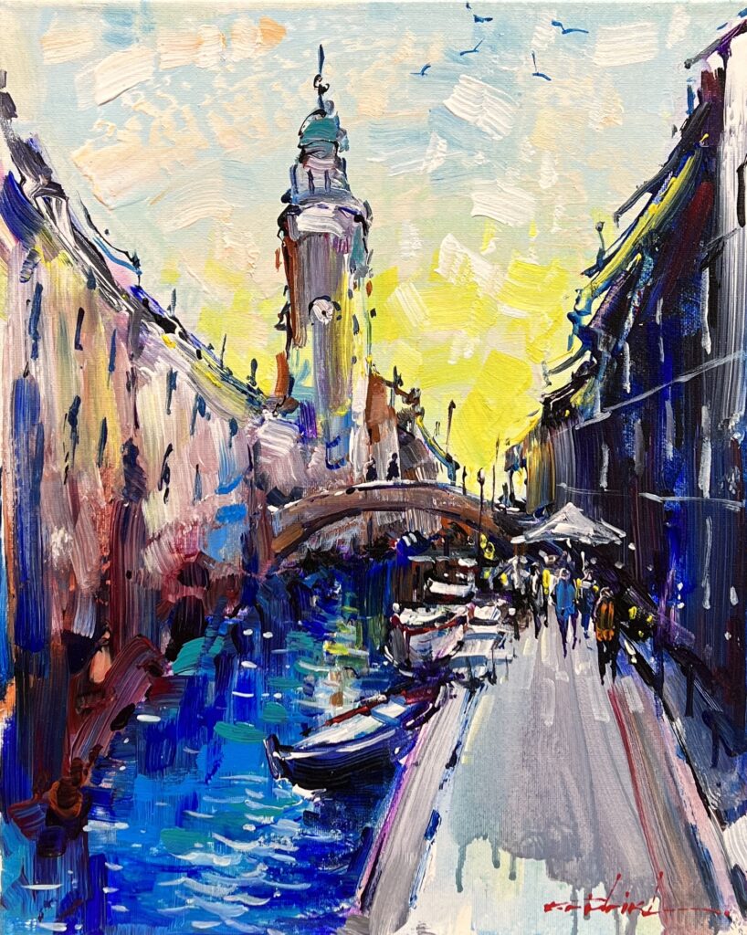 A vibrant testament to the ebullient spirit of post-impressionism, this painting captures a sunlit canal scene with exuberant strokes and a kaleidoscope of colors. The sky, a dreamy blend of azure and sunset gold, dances above a central clock tower that commands the composition with whimsical grace. The canal below, a liquid tapestry of sapphire and cerulean, reflects the day’s fading brilliance, punctuated by the lively hustle of boats and blurred figures.