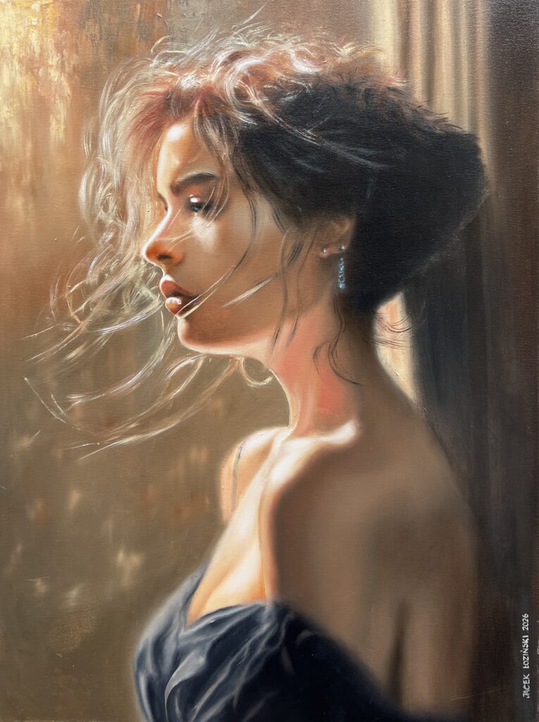 In an exquisite dance of light and shadow, this evocative portrait captures the ephemeral beauty of a moment suspended in time. The artist employs a masterful blend of Realism with a whisper of Impressionism, creating a canvas that pulsates with emotion and subtle drama. The woman's profile is bathed in a warm, golden glow, her hair a tempest of delicate strands, evoking both vulnerability and strength. The rich, earthy palette contrasts with the soft luminosity of her skin, skillfully focusing the observerβs gaze. This composition becomes a symphony of textures and shades, inviting a sense of intimacy and contemplation. Here, artful spontaneity meets deliberate precision, offering a timeless ode to quiet elegance.