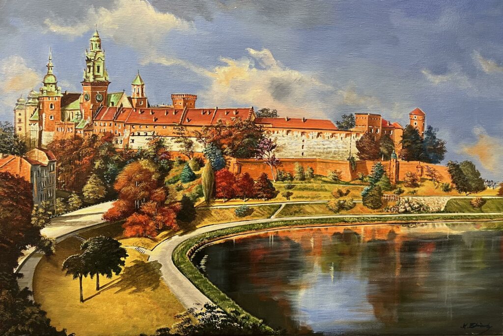 In a stunning celebration of architectural splendor and natural beauty, this canvas captures the regal majesty of Wawel Castle with a flourish reminiscent of late Romanticism. The artist’s deft brushwork envelopes the viewer in a tapestry of autumnal hues, infusing the scene with rich reds, golds, and verdant greens, casting a warm, inviting glow. The sky dances with playful clouds, their reflection gently caressing the still waters below, echoing the tranquil yet grandiose sweep of the landscape. With an air of timeless elegance, the juxtaposition of structured architecture against the fluidity of nature strikes a harmonious chord, evoking both the passage of time and the steadfastness of history. Strikingly evocative, this piece transcends mere depiction, drawing the observer into the very heart of Polish cultural heritage.
