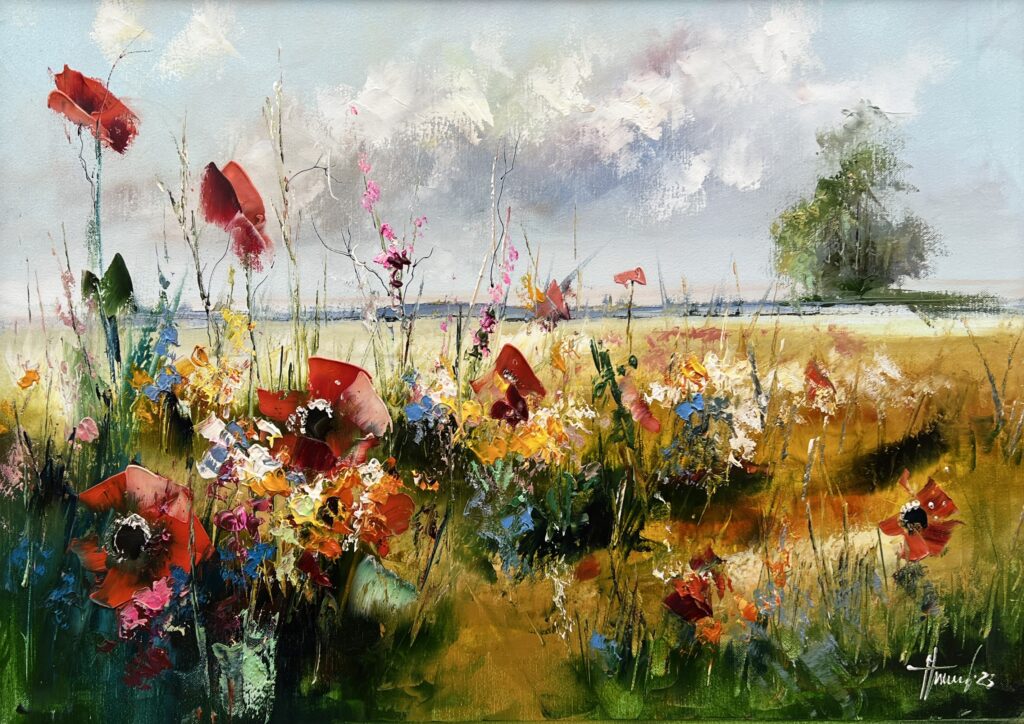 A vibrant dance of color unfurls across this canvas, capturing the very essence of a sun-kissed meadow in full bloom. The artist employs a vivid palette of fiery reds, sunlit yellows, and serene blues, weaving them into an intricate tapestry that suggests both chaos and harmony. Each poppy, each blade of grass, is suspended in a moment of sheer exuberance, inviting the viewer into this intoxicating dance of nature. The brushwork is loose yet deliberate, reminiscent of the Impressionists' desire to capture the fleeting effects of light and movement. A whispering breeze seems to ripple across the scene, evoking the whispers of distant summers. The composition, seemingly spontaneous, reveals depth and subtletyβa testament to the deft hand of its creator. This is not merely a landscape; it's a jubilant ode to nature's relentless beauty.