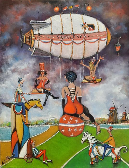Hundreds of paintings and sculptures are in collections all over the world, including USA, New Zealand and even Afghanistan also in all European countries. Currently inspired by ceramic art in a funny way trying to tell about human passions. Behind the fairy-tale decorations are hidden the deepest human passions and desires. Canvas stretched on wooden frame. Colors of the painting may slightly differ from photos due to screen settings.