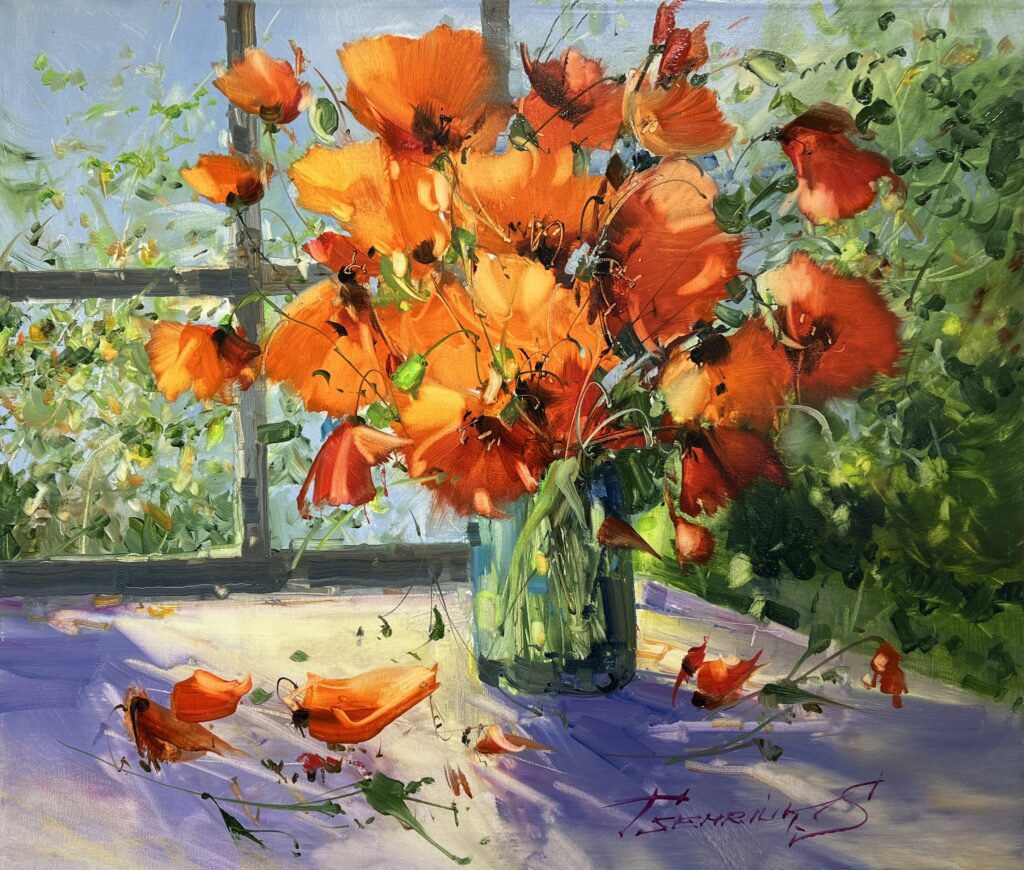 In a jubilant explosion of fiery oranges and sultry reds, this painting captures the ephemeral beauty of poppies basking in sunlight. The artist employs a spirited impressionist technique, where energetic brushstrokes dance across the canvas, imbuing the piece with life and movement. The vase, a quiet sentinel amid this vibrant chaos, anchors the composition against a backdrop of richly textured greens, suggesting a garden in full bloom just beyond the window. Light streams through, creating playful patterns on the tabletop, enhancing the sumptuous yet delicate transitions between the warm and cool palettes. This work is a veritable ode to summer, evoking both the fleeting nature of blooms and the eternal joy they inspire.