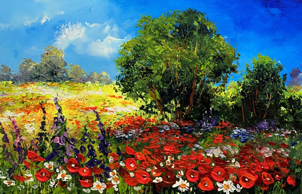 A vibrant celebration of nature's exuberance, this captivating artwork evokes the spirit of the Impressionists with a contemporary twist. An audacious dance of color sweeps across the canvas, where the lively reds of poppies flirt with the bold purples of towering flowers. Earthy greens extend across the scene, their vibrancy pulsating through the delicate brushwork. The background emerges softly, bathed in the tender embrace of a cerulean sky, punctuated by playful wisps of clouds.