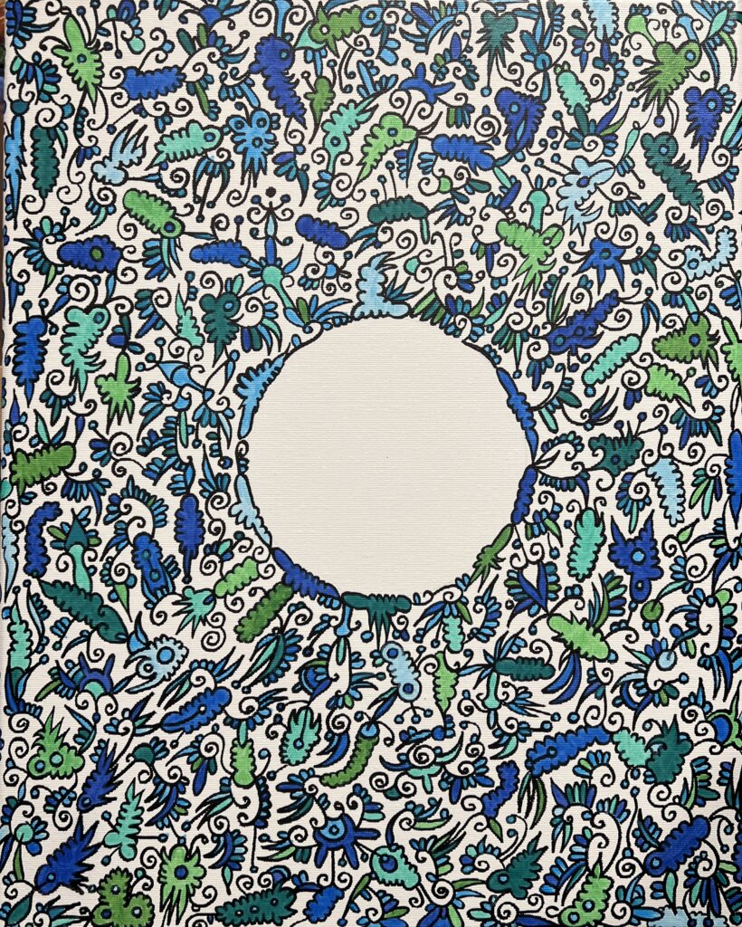 In an entrancing whirl of vibrant hues, this piece deftly dances between whimsical abstraction and a nod to psychedelic artistry. The canvas is joyfully inhabited by a dynamic choreography of swirling forms, predominantly in azul and verdant tones, spiraling around a central void that suggests infinite possibilities. The intricate patterns evoke a delicate balance akin to nature’s own chaotic harmony, brimming with life yet leaving space for contemplation. The artist’s confident hand and vivid imagination transform simple color contrasts into a symphony of texture and emotion. This labyrinthine assembly captures the viewer, inviting them to explore both the overt and the hidden, in a delightful dialogue of color and form.