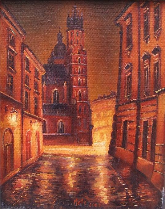 Leszek Metz maluje architekture krakowa, sceny rodzajowe, postacie kobiet.