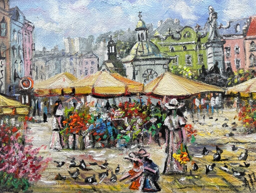 "FLORISTS" by Artur Partycki is a captivating oil on canvas painting that captures the beauty of a bustling market square. The painting features a florist surrounded by a monument of Adam Mickiewicz, a church, and other elements of the Krakow cityscape. The vibrant colors of green, midnight blue, orange, and white create a stunning contrast that is sure to draw the eye. The 18x24cm size of the painting makes it perfect for any home or office, adding a touch of modern art that will only increase in value over time.