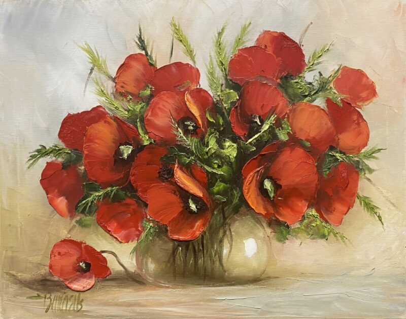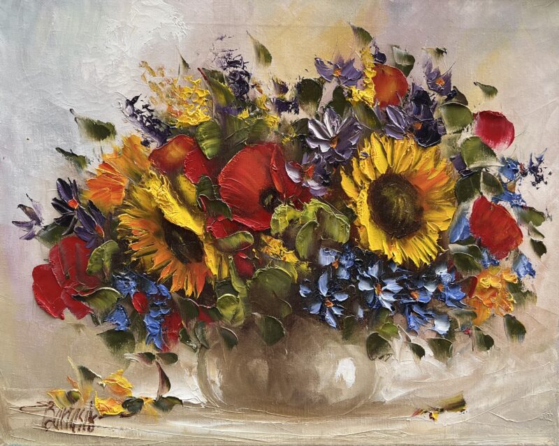 Sunflowers, like little suns, illuminate the space with their golden aura, poppies burn like a summer afternoon, and blue and purple accents add harmony and depth to the composition. The brushstrokes are bold, almost sculptural, giving the painting a lively dynamic - as if the flowers went beyond the frames and invited us into their world!