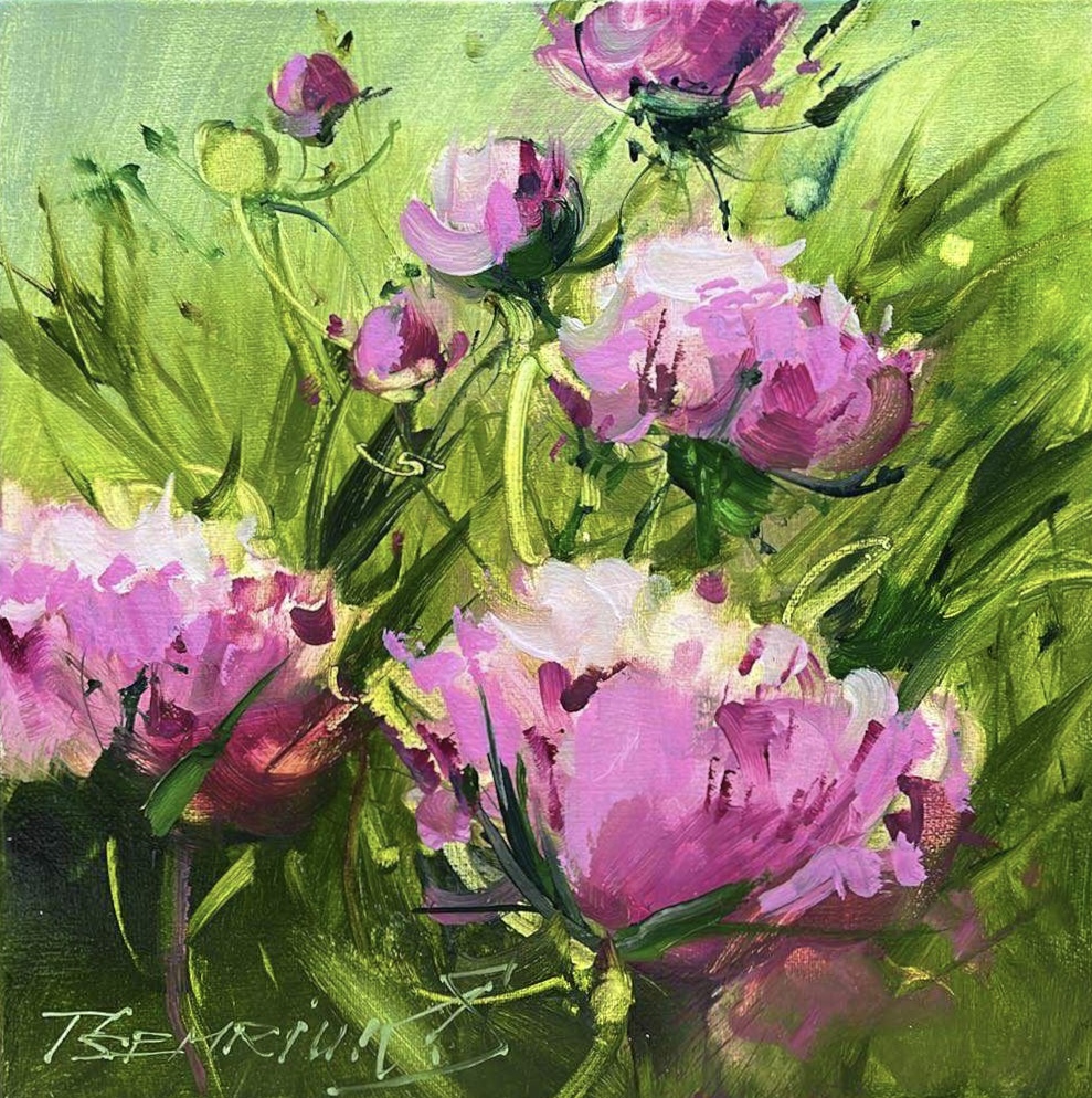 In a delightful symphony of pinks and greens, this exquisite canvas bursts with the vivacity of a summer garden. Each brushstroke seems to dance with the whims of an Impressionist spirit, capturing the ephemeral beauty of blooming peonies. The luscious hues of magenta and fuchsia ripple against a verdant backdrop, inviting the viewer into a radiant embrace of nature's splendor. The painter's deft hand brings a dynamic texture to the foliage, creating both depth and movement that tempt the eye to wander. This piece, while rooted in tradition, playfully nods to contemporary abstraction, making it an enchanting jewel in any collection.