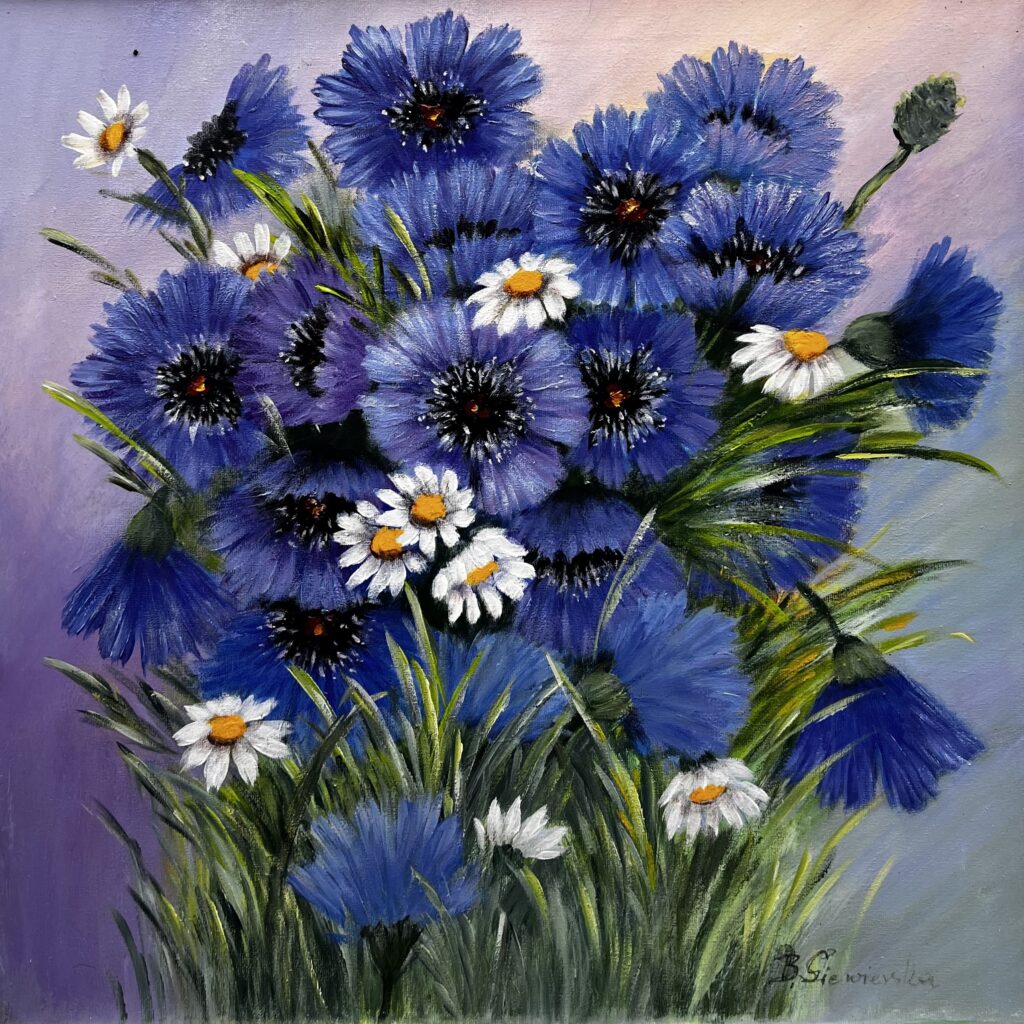 This painting is a lyrical ode to nature and silence β not the kind you hear, but the kind you see, captured in the serene blues of cornflowers and the gentle brightness of wild daisies. The artist, working in the timeless language of oil painting, has created a bouquet not only of flowers but of atmosphere and emotion. The composition is both balanced and spontaneous, as if the flowers had just been gathered from a sunlit meadow, still carrying the dew of a summer morning.