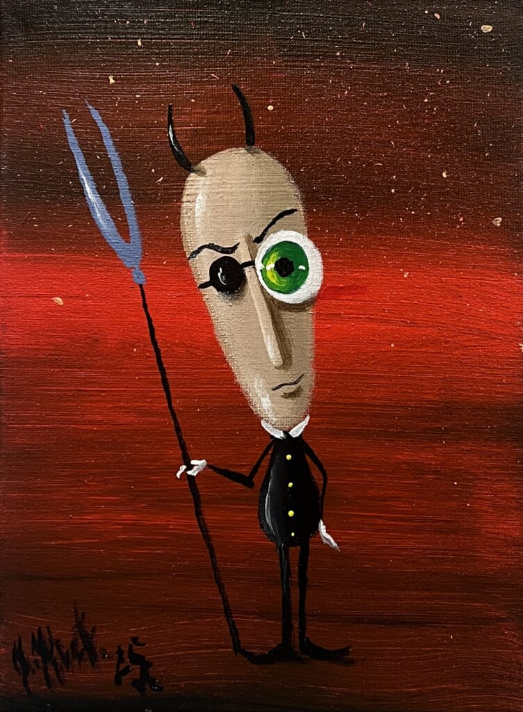 In this whimsical and enigmatic tableau, an elongated figure stands poised against a vivid vermilion backdrop, its intensity echoing the surrealist fervor of a dreamscape. The artist employs a mischievous palette, where deep reds flirt with the unsettlingly playful character at the center. The figure’s exaggerated green eye, singular and expressive, peers with a knowing gaze, as if channeling the spirits of both Magritte and Tim Burton. Blue fork in hand, it suggests a playful nod to diabolic iconography, yet with a twist of cartoonish charm. The bold contrast between the sharply outlined figure and the textured cosmic background weaves a narrative of paradox—a dance between innocence and devilry, reality and imagination.