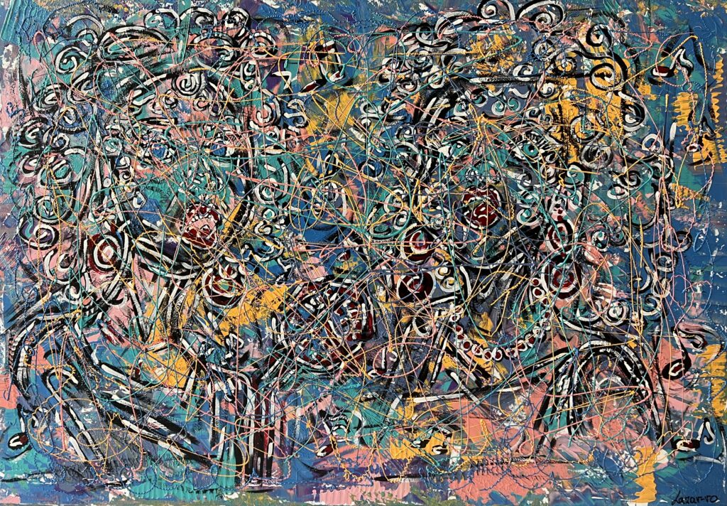 In this exuberant abstract, layers of spiraling black calligraphy dance across a vibrant field of teal, coral, and gold. Tangled strands of paintβapplied in gestural drips and crisp stencilsβweave a rhythmic tapestry that pulses with kinetic energy. Through its sumptuous textures and interlaced motifs, the work becomes a visual concerto, inviting viewers to lose themselves in the ecstatic interplay of form, color, and motion.