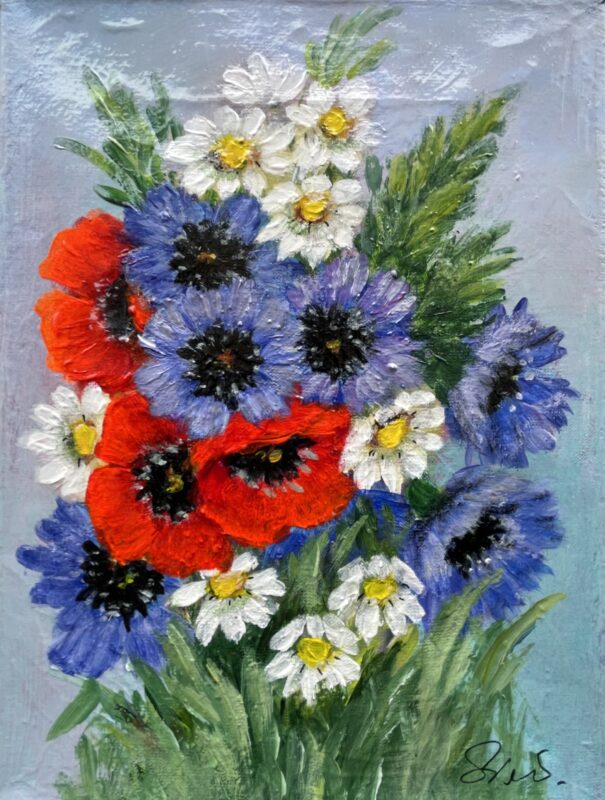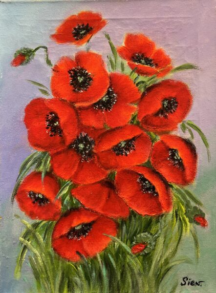 Gathering of Poppies offers a vivid and emotionally resonant portrayal of one of natureβs most iconic blooms. The densely arranged bouquet of scarlet-red poppies, with their dark velvet centers and lush green foliage, fills the canvas with quiet intensity. Their sculptural quality and deep saturation contrast gently against a misty periwinkle background, creating both drama and serenity.