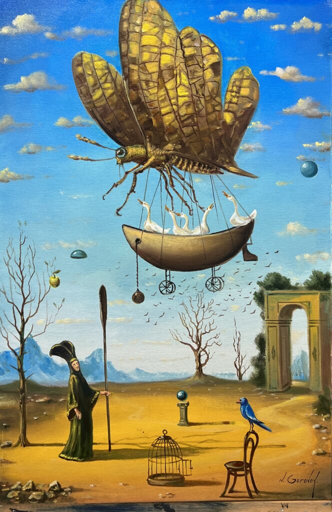 In this whimsical tableau, a surreal landscape unfolds under a cerulean sky dotted with cotton candy clouds. A colossal dragonfly carries an elegant gondola filled with swans, a nod to the fantastical whims of dreams. Earthy ochres and vibrant blues create a visual symphony, a delicate dance between earth and sky, reality and imagination.
