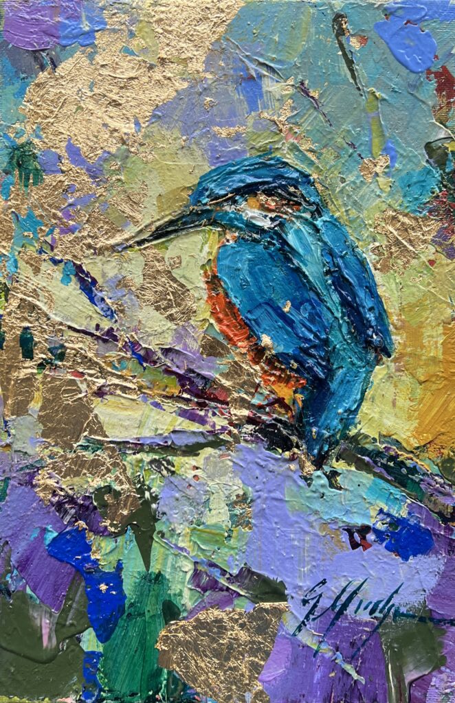 A vibrant tableau of nature's ephemeral splendor, this piece captures a kingfisher poised in a dance of color. The artist masterfully interweaves thick impasto strokes with vivid blues and shimmering gold leaf, evoking both movement and stillness. Echoes of Expressionism emerge in the textured layers, where every brushstroke pulsates with life. The rich hues of orange and teal contrast against a lush backdrop, reminiscent of a garden at dawn. In its daring composition, the kingfisher becomes both muse and masterpiece. This painting is an ode to the joys of spontaneous creation and the beauty in transient moments. An absolute treasure for any connoisseur of contemporary art.