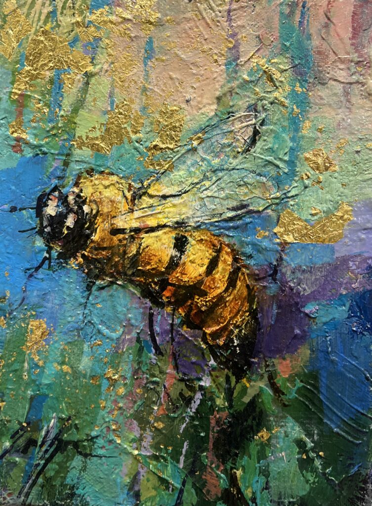 In a delightful dance of chromatic vivacity, this exquisite artwork captures the humble yet heroic existence of a bee, cast in luminescent hues that shimmer with metallic allure. The palette is a jubilant symphony of golden yellows and azure blues, elegantly complemented by hints of emerald and amethyst, reminiscent of a fleeting summer day captured in time.