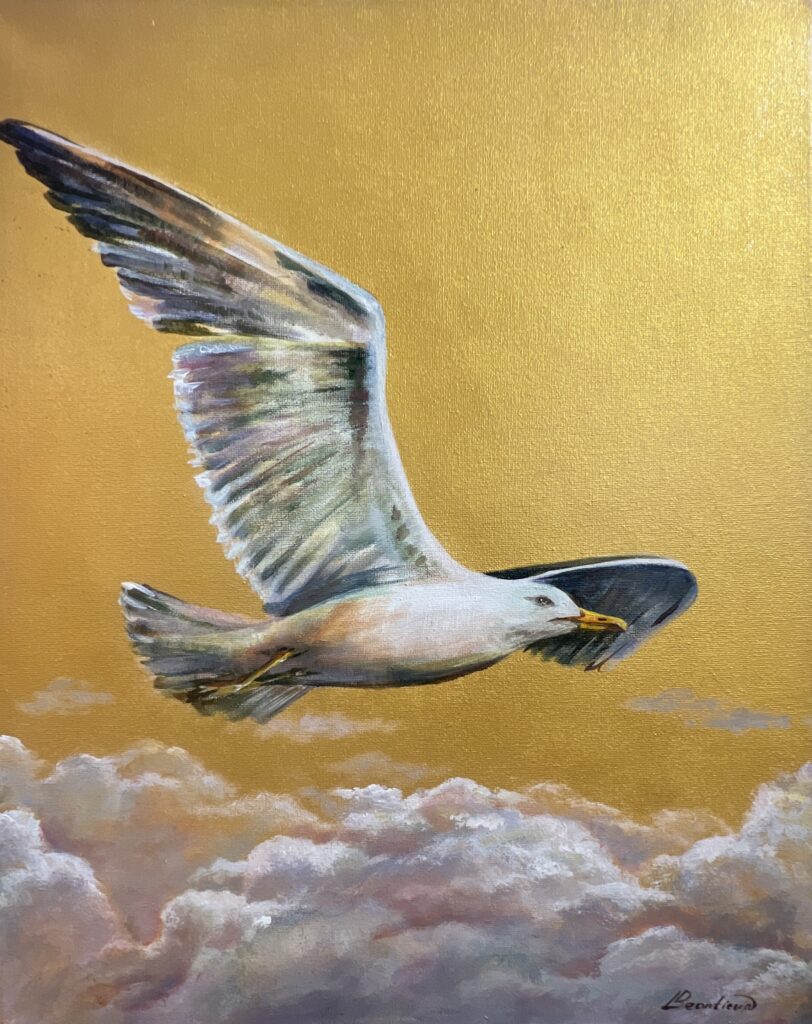 A celestial ballet of avian grace unfolds upon this gilded canvas, where a solitary seagull soars with majestic aplomb. Rendered with a deft brush, the bird emerges as the protagonist against a luminous golden backdrop that whispers of Byzantine opulence and dreams. The artist's mastery is evident in the interplay of delicate, iridescent feathers, capturing the ethereal dance of light and color.