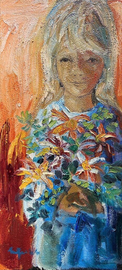 Girl with Autumn Flowers presents a gentle yet expressive portrait of a young girl cradling a vibrant bouquet of fall blooms. Rendered in sweeping, textural brushstrokes, the composition blends figuration with impressionistic colorwork fiery oranges and earth reds juxtaposed with cool blues and bursts of yellow and green.